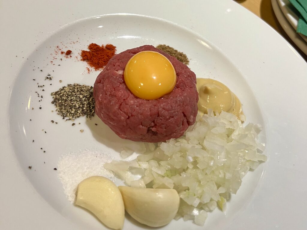 新鮮な牛ひき肉に卵黄とタマネギ、さまざまなスパイスを混ぜ合わせて、