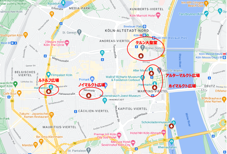今回の旅では下の地図にある、4つのエリアのクリスマスマーケットに訪れました。