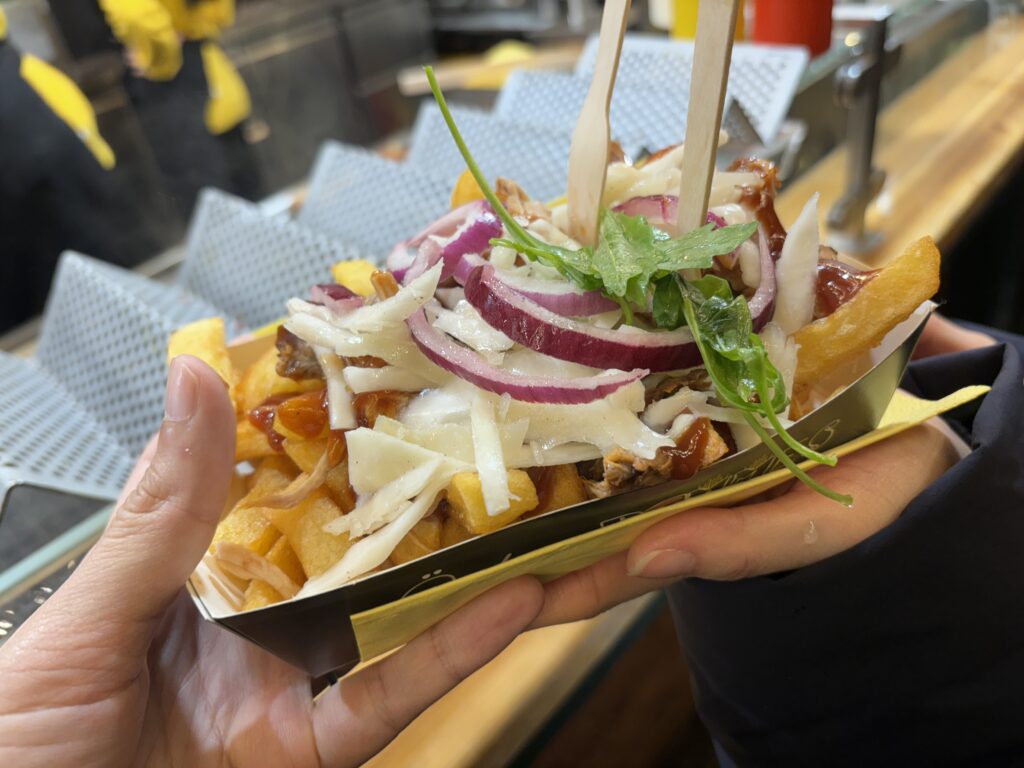 お肉系も魚介系もあって、マーケット2周するくらい迷った挙句、コスパ的にこちらを頼みました。